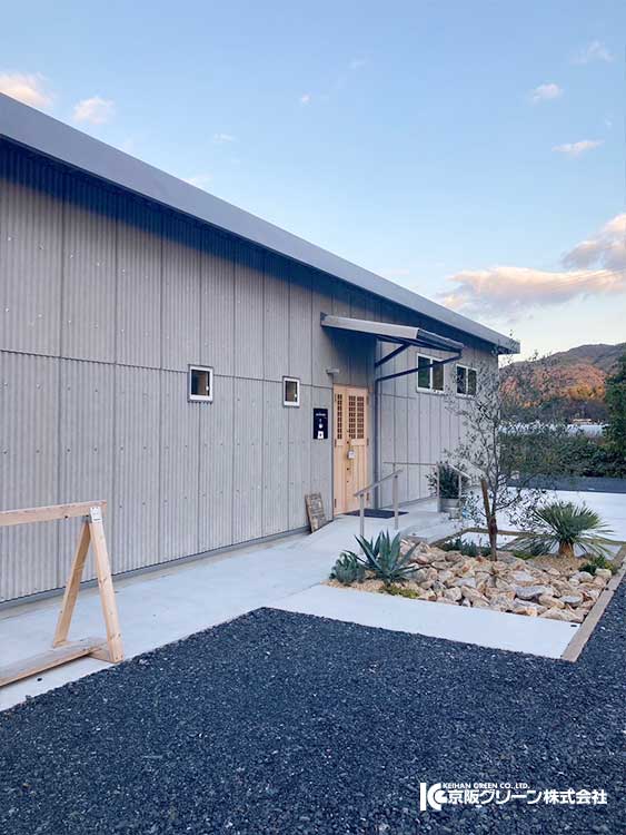 倉庫をリノベーションした建物に合わせ、シンプルナチュラルなエクステリアにまとめました。