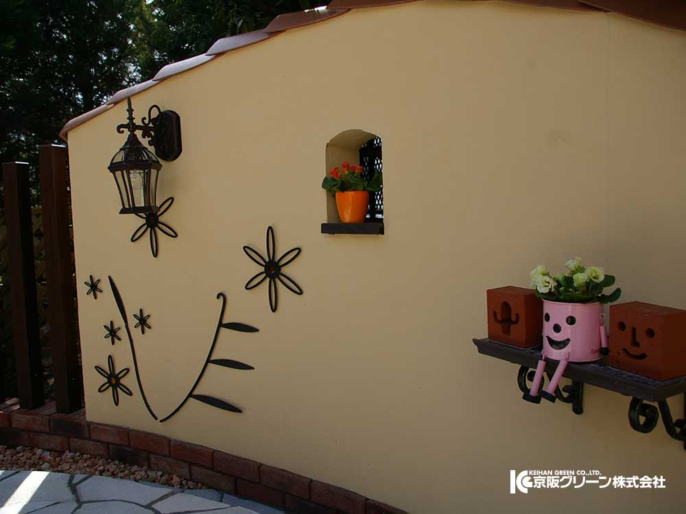 曲線を活かした欧風の壁にはオンリーワンのウオールアクセサリーで可愛い花模様を表現しました。